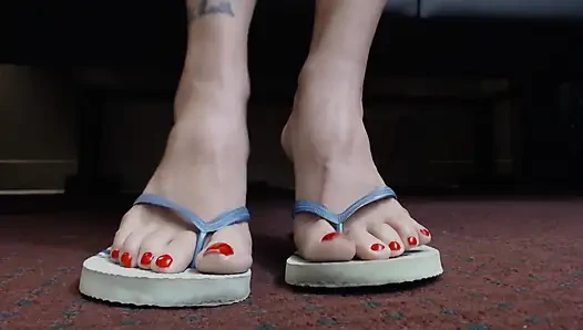 Parmak arası terlikli güzel kırmızı ayak tırnakları